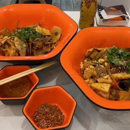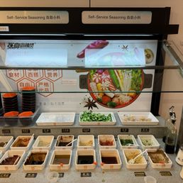 Here, you choose your own toppings at a self-serve bar with thinly sliced meats, veggies, seafood, fishballs, noodles, ricecakes- everything you can think of. The largest selection I've seen, even at all-you-can-eat places. I like how you can get as much or as little as you like, since it's charged by weight. Choose between their classic bone broth (spice level up to you) or other flavors, then they cook for you and bring it out once it's done. Plenty of seating, price is reasonable, and they also have a sauce bar!